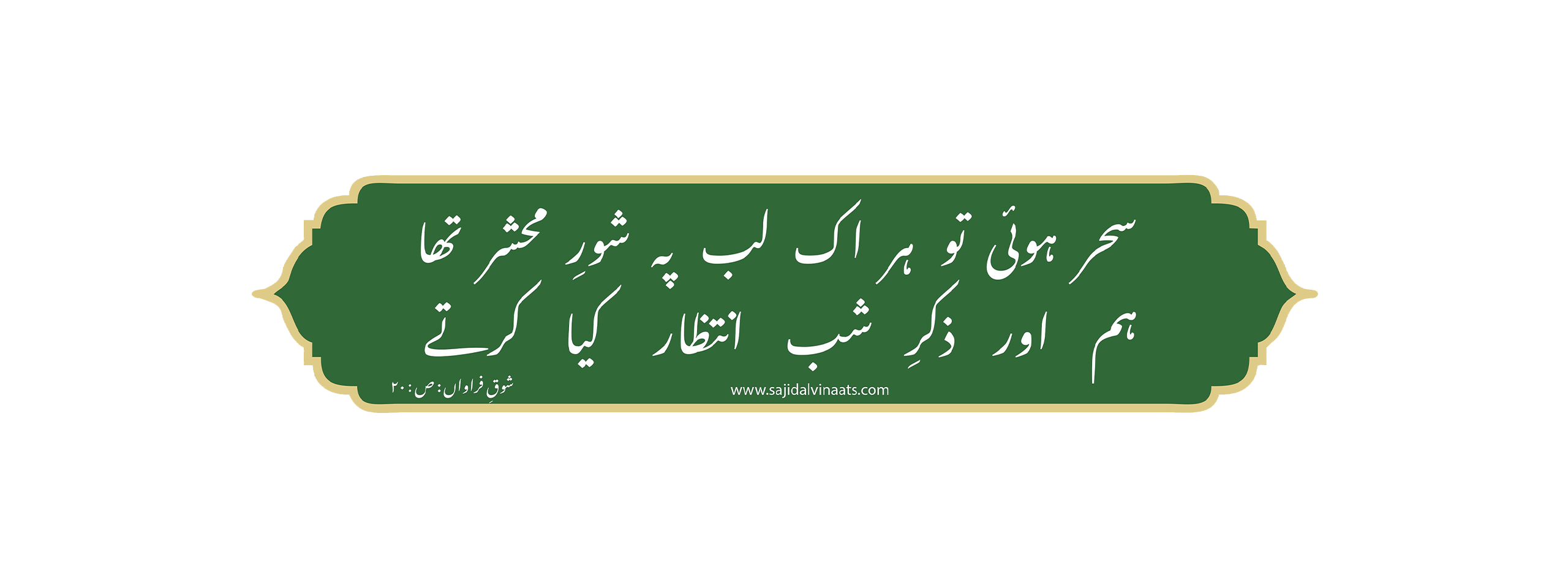 The first Naatiya collection of Sajid Alvi is “Noor-o-Saroor” which has been greatly appreciated by both the special and the general audience, and then one after the other named as Unki Yaad Unka Khyal, Mehrab-e- Jaan, Jaan-e-Jahaan, Shouq-e-Farawaan, Rubayat-e-Sajid Alvi (which is attributed to Hazrat Pir Syed Shah Abdul Haq Gilani of Golra Sharif, may his soul rest in peace) have gradually gained popularity due to their enthusiasm and taste for beauty. The tradition of his Naat recitation continues and there is a desire to write more. May Allah grant Sajid Alvi complete health and a long life. Ameen.